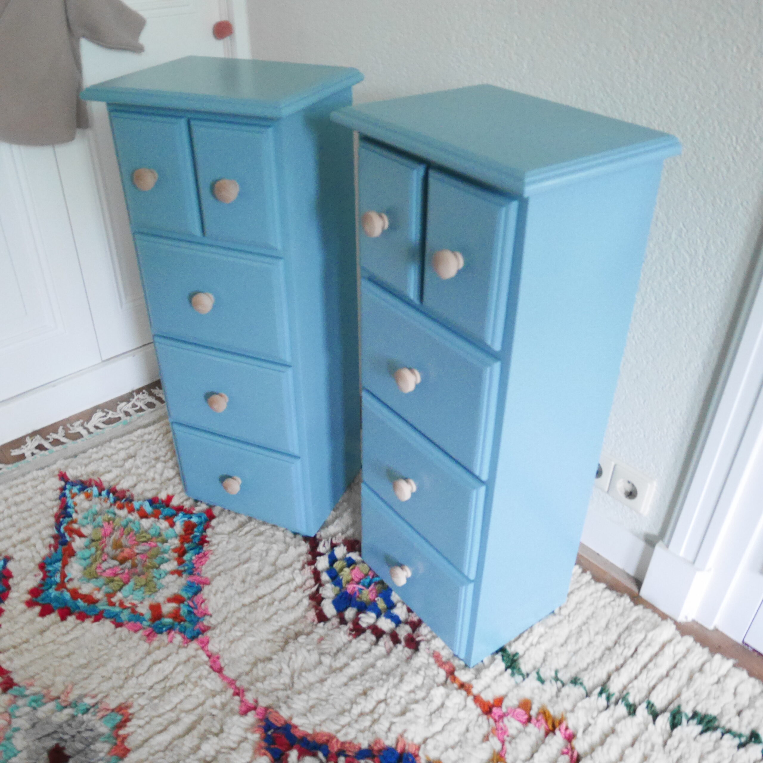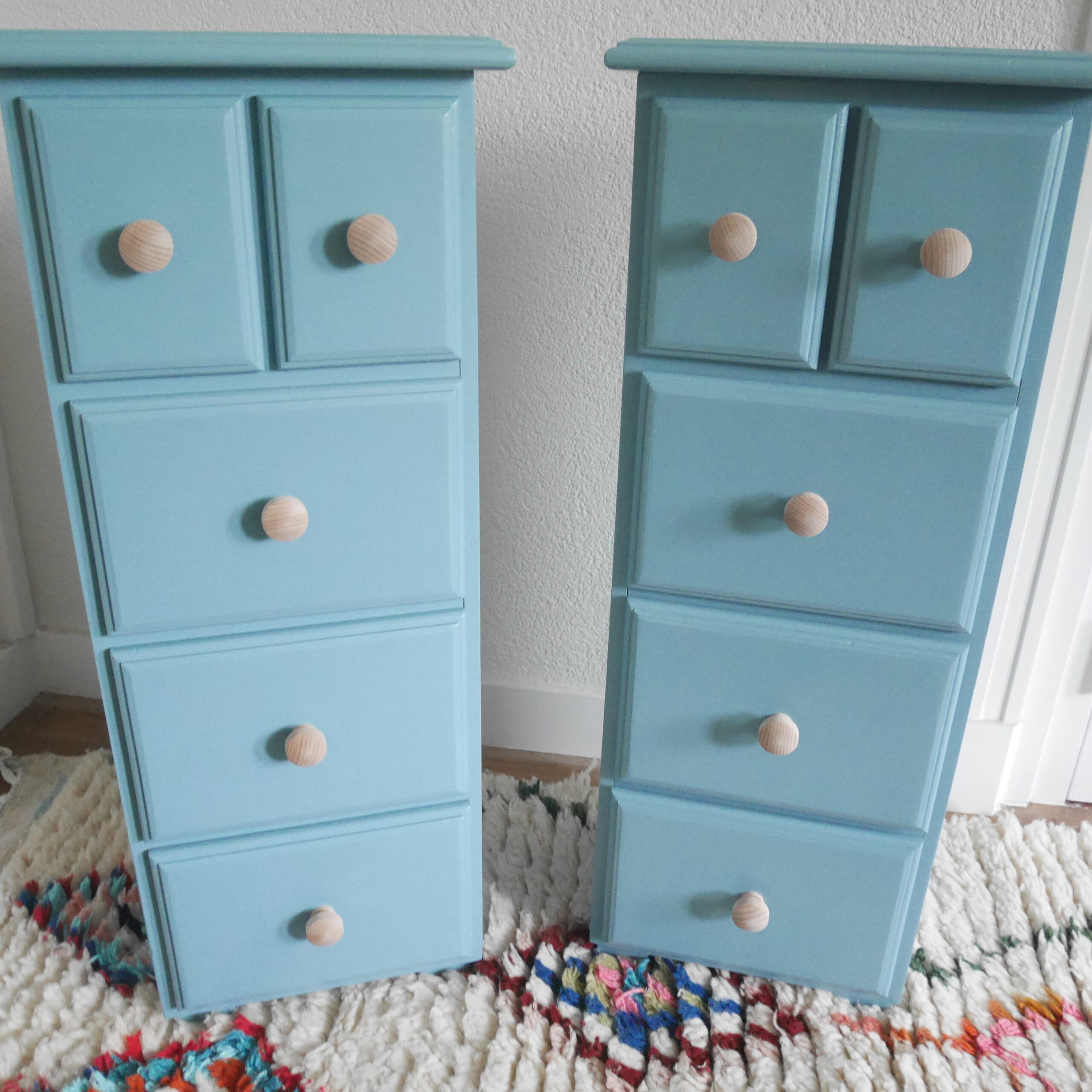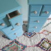 Deze charmante lichtblauwe vintage ladekastjes vormen een prachtig duo voor in de kinderkamer. Met hun zachte, frisse kleur brengen ze meteen rust en speelsheid in de ruimte. De compacte vorm en het slanke ontwerp maken ze ideaal als nachtkastjes naast een kinderbed, als handige opbergers voor kleine schatten of als stijlvolle aanvulling op een commode of speelhoek.