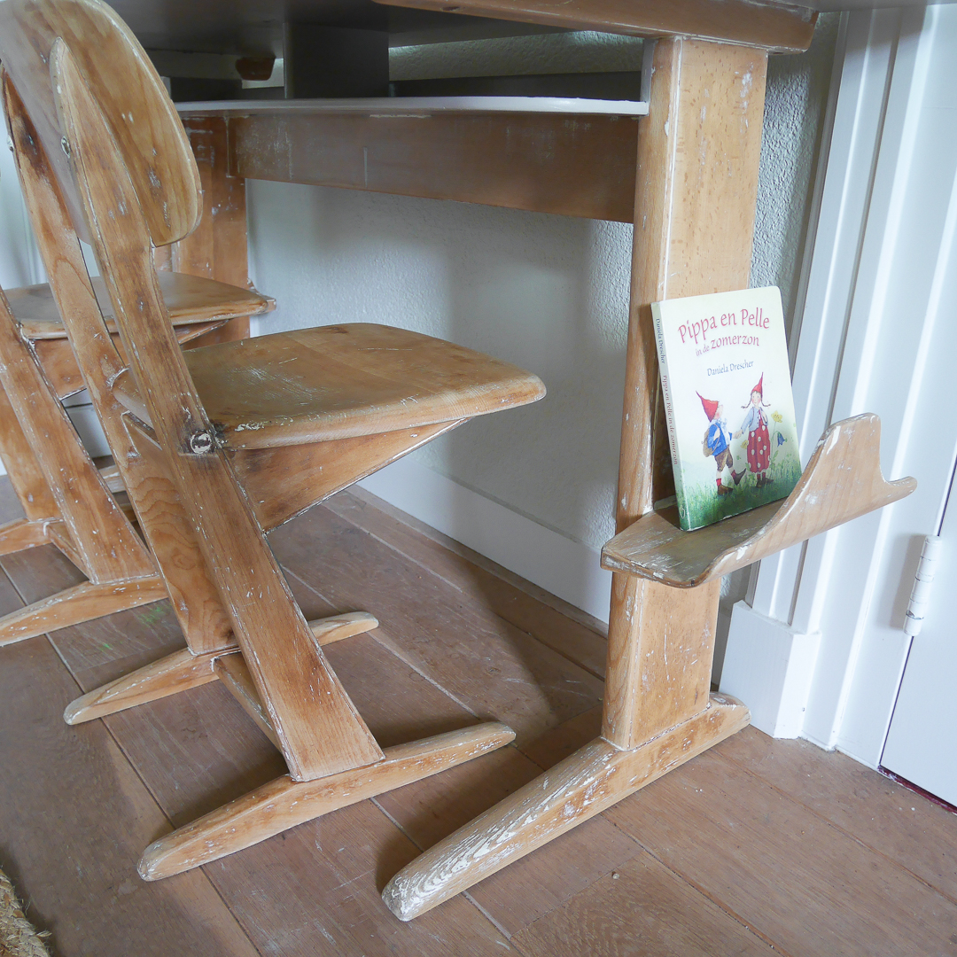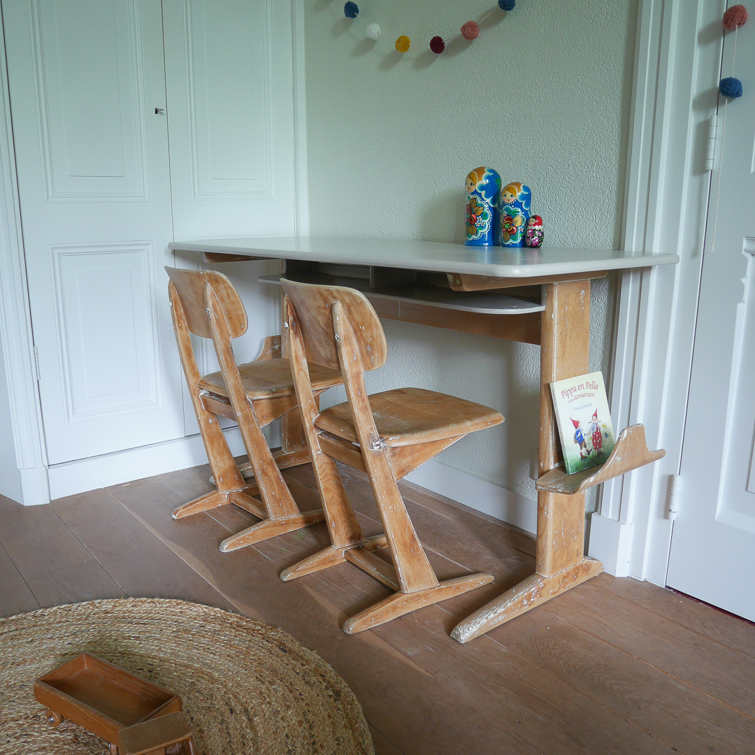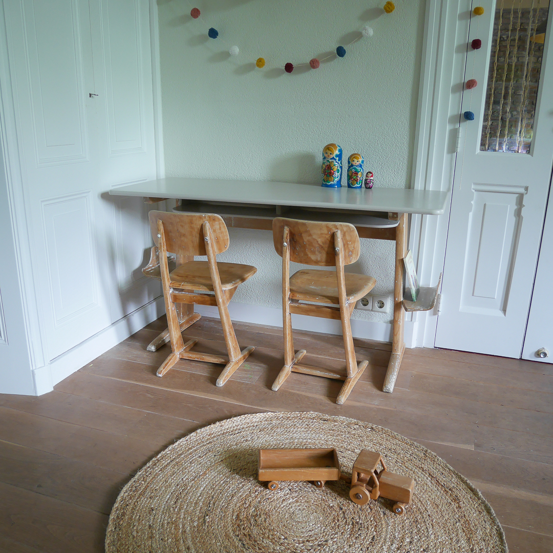 Oh wat is dit een leuk tweepersoons kinderbureautje met twee stoeltjes. Het is een origineel Vintage Casala bureau. Perfect voor een plekje in de woonkamer of kinderkamer om heerlijk aan te knutselen en tekenen. Ik heb het bureautje gedeeltelijk kaal gemaakt, waardoor je nog wat oude verfresten ziet zitten. Daarna heb ik het blad opnieuw geverfd in een mooie natuur tint en het onderstel en stoeltjes heb ik behandeld met een doorzichtige lak. Nu is hij op zoek naar een gezellig nieuw huisje!