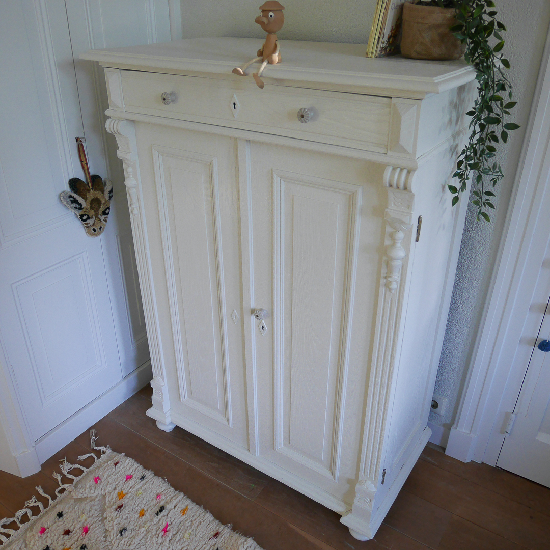 De kast is gezandstraald en heeft daarna onze kleur Lelie gekregen, een mooie witte neutrale kleur die in veel ruimtes perfect tot zijn recht zal komen.